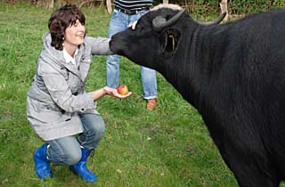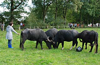 | Unbedingt den persönlichen Kontakt zu diesen faszinierenden Tieren suchte Ministerin Grotelüschen und taufte eine noch namenlose Färse, die mit 5 weiteren Jungtieren im Juli 2010 aus Kärnten/Österreich nach Huntlosen gekommen war, auf den Namen OLGA (OL wie Oldenburg, G wie Großenkneten und A wie Astrid). |
