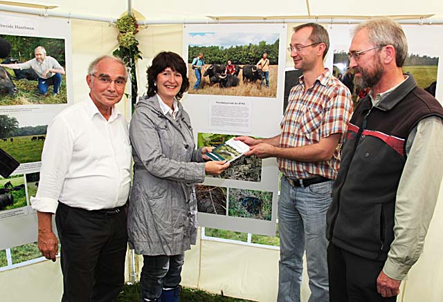 | In Gegenwart von Revierförster Karl-Heinz Frese (v.r.) überreichen Dr. René Krawczynski und Peter Biel im Ausstellungspavillon die erste europaweite Buchveröffentlichung zum Thema Landschaftspflege mit Wasserbüffeln an die Niedersächsische Landwirtschaftsministerin Astrid Grotelüschen. |