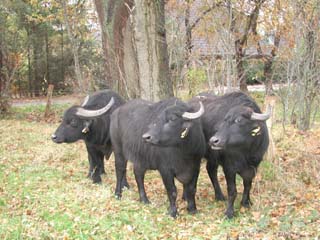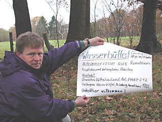 | Nach der Rückkehr von "Stammvater Fridolin" von seinem "Ausflug" in das Biosphären-Reservat Schorfheide in der Uckermark folgte sein Einsatz in Oldenburg. Gemeinsam mit den Büffelkühen "Rosa" und "Lisa" wurde er am 2. November 2002 auf die Feuchtweide in der Haaren-Niederung verlegt. Groß war das Interesse der Anlieger, die zunächst nicht ihren Augen trauen wollten, sich aber über die Nachbarschaft der Wasserbüffel sehr gefreut haben. | ||||||||||