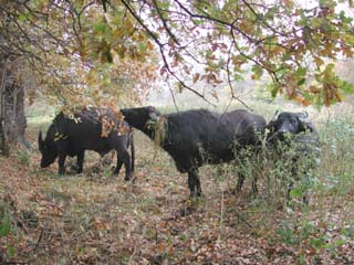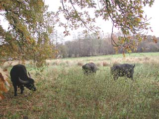 | Von Anfang an fühlte sich das Trio wohl auf der neuen Weide. Futter war auch im November noch reichlich vorhanden. | Für Rinder und Pferde ungeeignet sind diese feuchten Weiden, auf denen sich der Wasserbüffel aber besonders wohl fühlt. Auch die Binsen wurden nicht verschmäht. | |||||||||