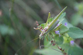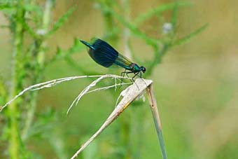 Blaugrüne Mosaikjungfer (Aeshna cyanea), Gebänderte Prachtlibelle (Calopteryx splendens), Grünes Heupferd (Tettigonia viridissima), Gemeine Strauchschrecke (Pholidoptera griseoaptera).