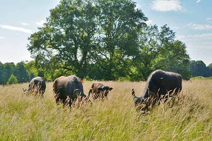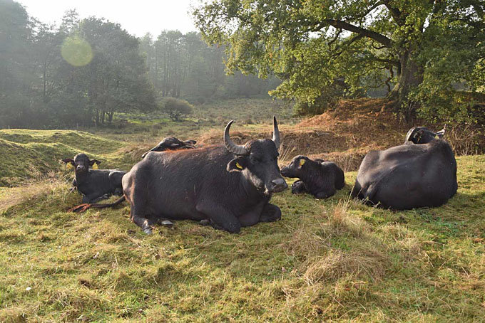 Abb. 1: Zwei Büffelkühe mit ihren Kälbern zu Beginn der Beweidung (oben)