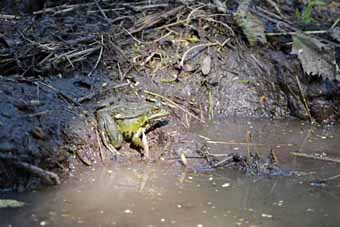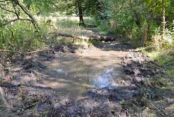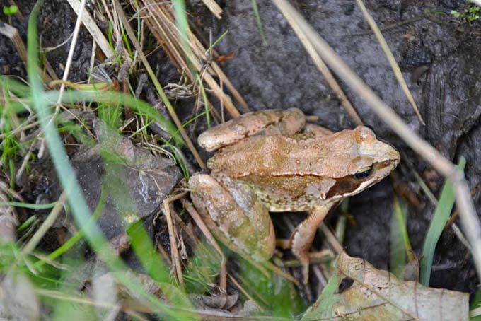 Dauerhaft Wasser führende Suhle mit einem Wall aus Schlamm (oben links), Teichfrosch (Rana esculenta) in der Suhle (oben rechts), Grasfrosch (Rana temporaria).